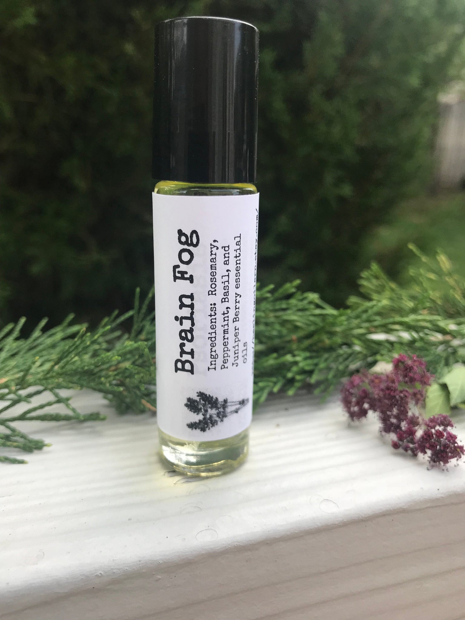 Brain Fog roller contains Rosemary, Peppermint, Basil, and Juniper Berry. This blend helps increase mental clarity and concentration.