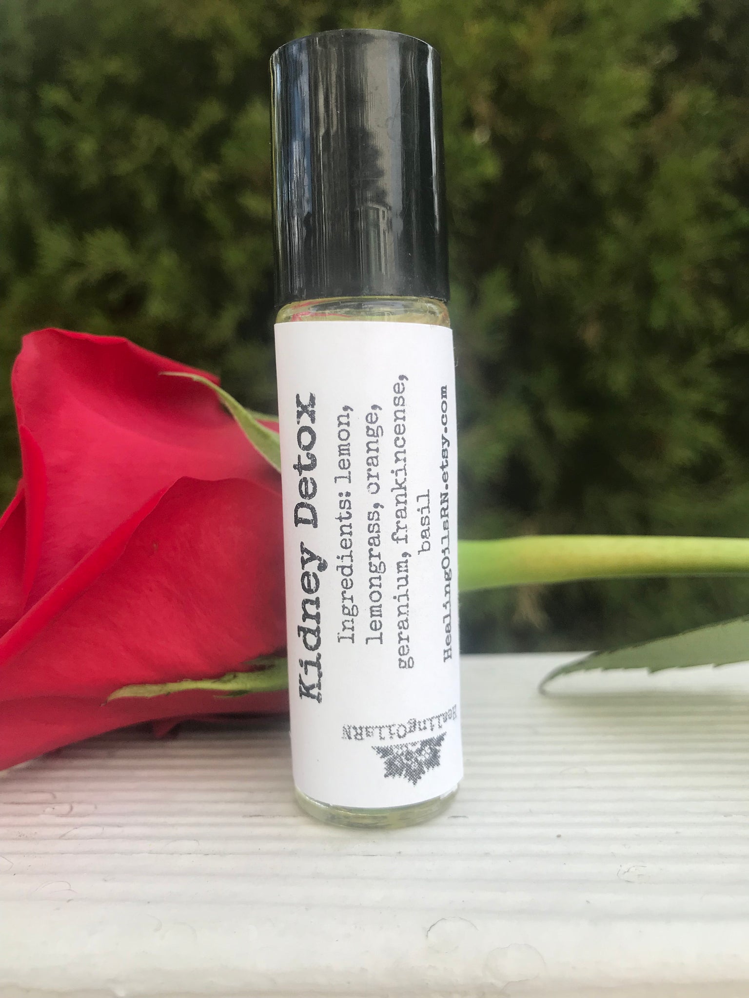 Kidney Detox essential oil blend contains lemon, grapefruit, lavender, peppermint, lemongrass, and ginger.